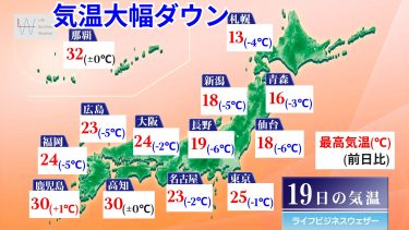 北海道が-3度前後、東北で4度ぐらいと18日に比べて3度前後低くなるでしょう。北海道は日中も氷点下の所が多くなるため、寒さ対策をしっかりと行ってください。