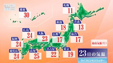 最高気温は、週末26日(日)にかけては西日本と東海で11度ぐらいと、概ねこの時期らしい気温となりそうです。来週中頃は、気温がグッと上がり桜が咲く頃の暖かさが予想されています。