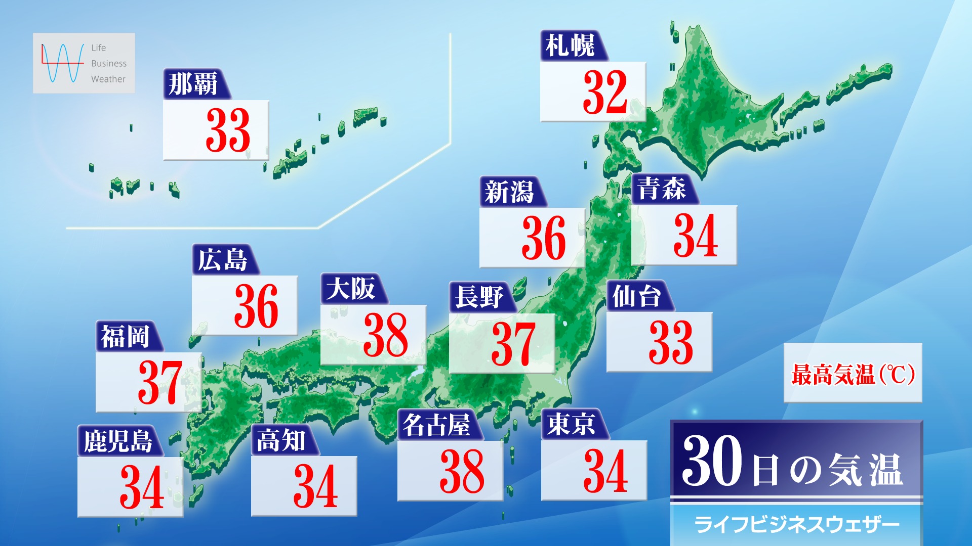 今日30日(水)は、北海道から九州は晴れて日差しが照り付けますが、北海道や関東、東海の山沿いでは夕立や雷雨があるでしょう。また、沖縄・奄美は台風8号が遠ざかりますが湿った空気の影響が続くため、雨や雷雨となる所があり、高波に注意してください。