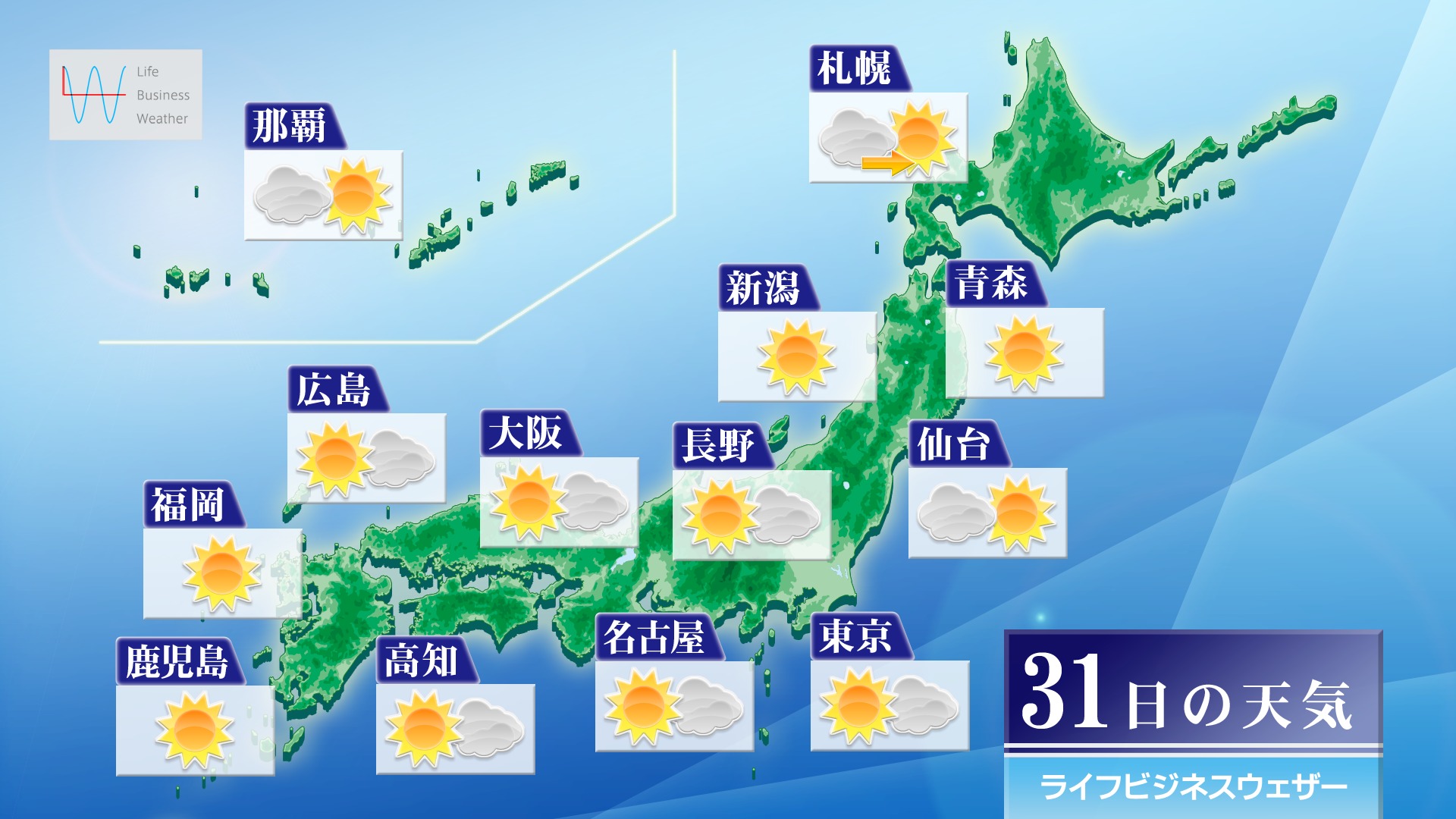 明日31日(木)は、高気圧の圏内となり、北海道から九州の広い範囲で晴れて日差しが届くでしょう。午後は、関東や東海の山沿いを中心に雨や雷雨となることがありますが局地的で、概ね安定した晴天となりそうです。