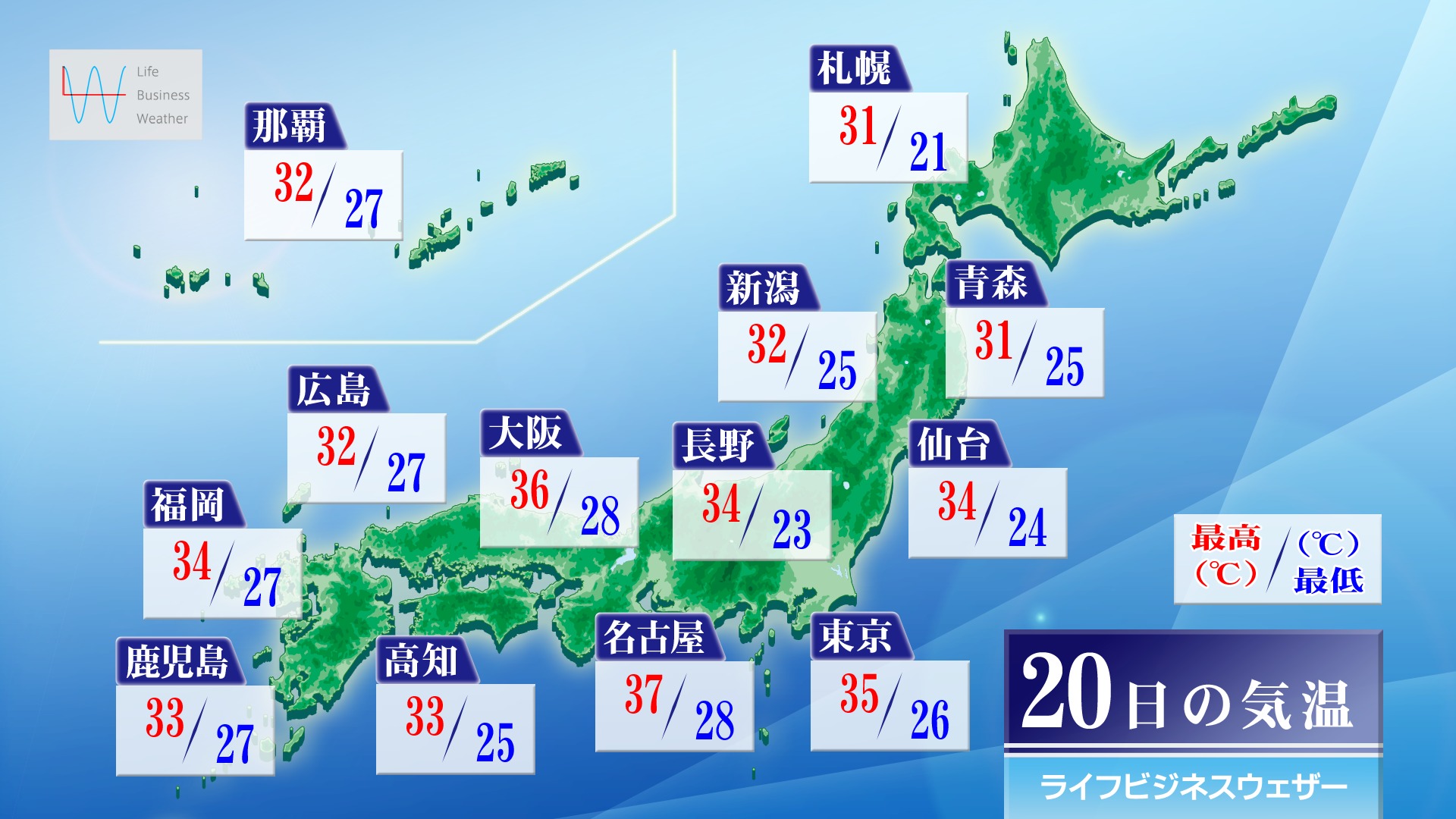 雨の降る北海道や東北北部は30度前後にとどまりますが、東北南部から沖縄は35度前後まで上がるでしょう。関東や東海は体温超えの危険な暑さになりますので、昼間の外出は極力控え、熱中症対策を万全に行ってください。