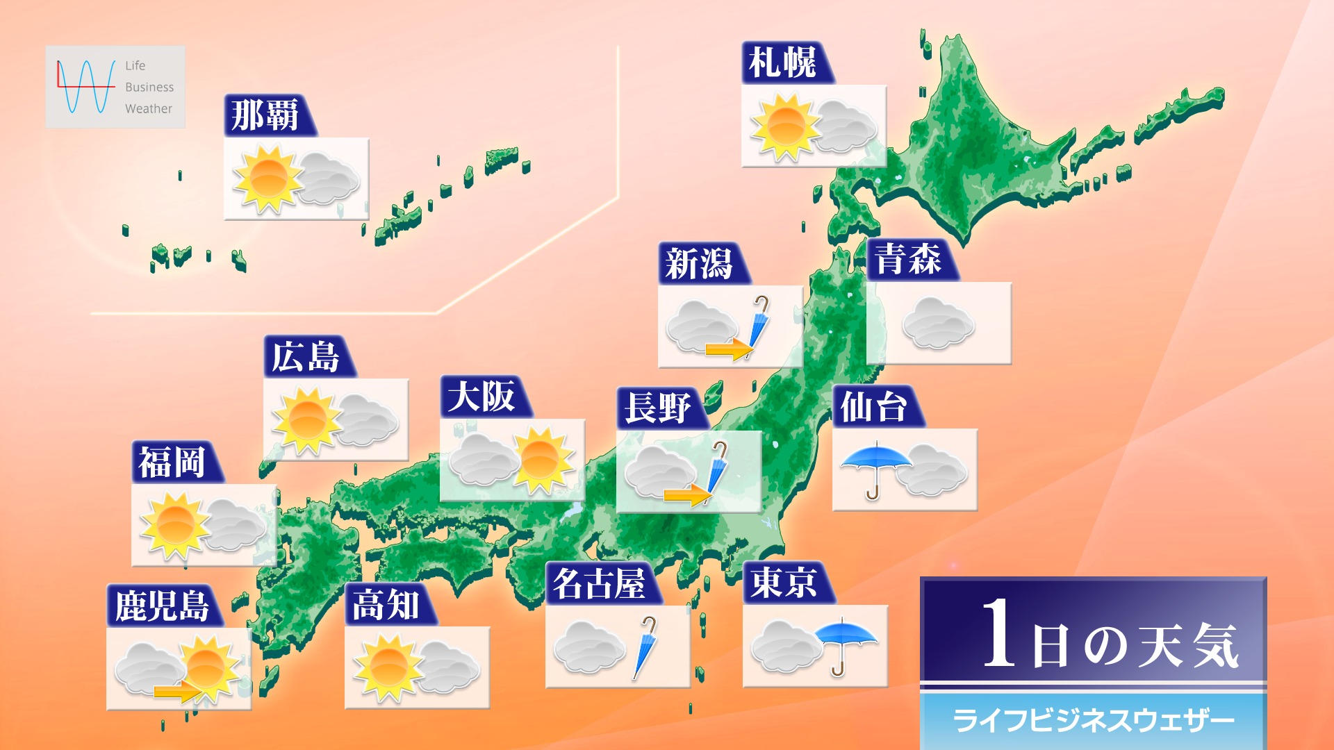 今日30日(火)は、移動性高気圧に覆われるため、全国的に晴れるでしょう。ただ、関東から沖縄は次第に雲が増え、にわか雨や雷雨の可能性があります。折り畳みの傘があると安心でしょう。