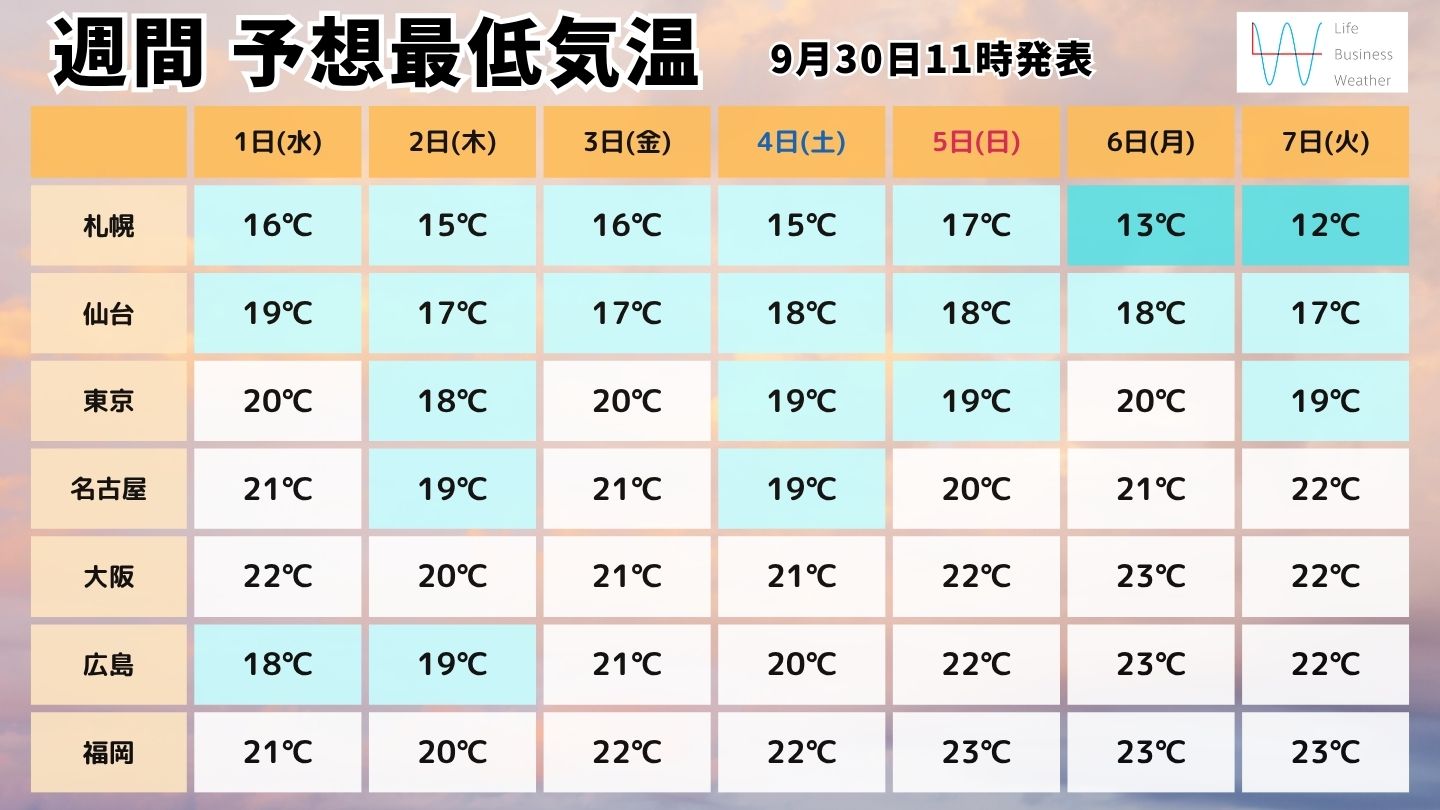 北日本では朝晩は20度を下回り、来週は北海道で10度前後となる日もありそうです。東・西日本も20度前後となる所が多く、空気が少しヒンヤリと感じられるでしょう。