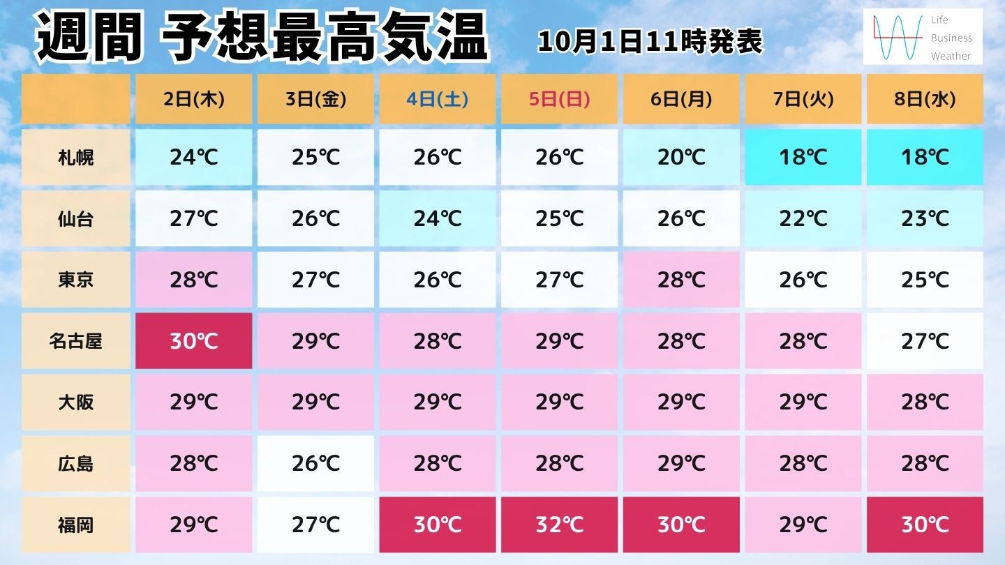 最高気温は、東海から沖縄で30度前後となり、厳しい残暑が続くでしょう。昼間はまだ半袖が活用しますが、朝晩は少しずつ気温が下がりますので、一日の中の寒暖差に注意が必要です。