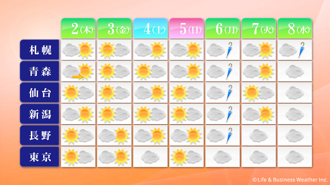 北海道や東北は、2日(木)は多少晴れ間がありますが雲が多く、急な雨や雷雨の所があるでしょう。3日(金)は晴れますが、4日(土)以降は次第に雲が増えて、6日(月)は大雨や荒れた天気となるおそれがあります。7日(火)以降は多少晴れ間が出ますが、8日(水)は北海道で雨が降るでしょう。