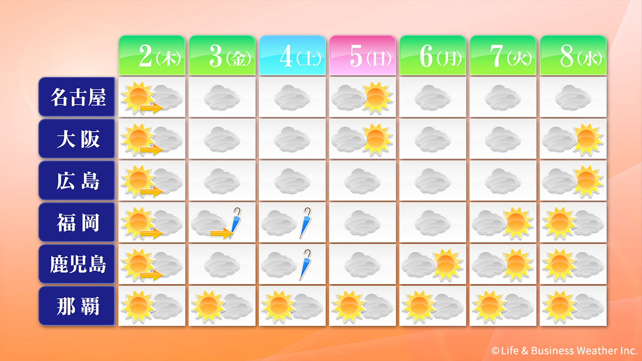 2日(木)は東海から九州で晴れますが、次第に雲が増え、3日(金)は西から雨の範囲が広がるでしょう。4日(土)から5日(日)は西日本太平洋側中心に雨が降りやすく、6日(月)は日本海側中心に雨となりそうです。7日(火)以降は雲が多めながらも日差しが戻るでしょう。