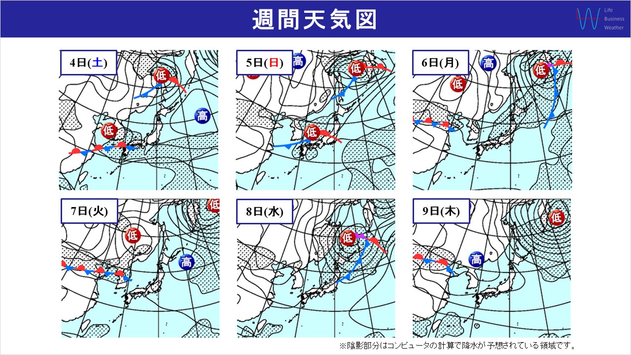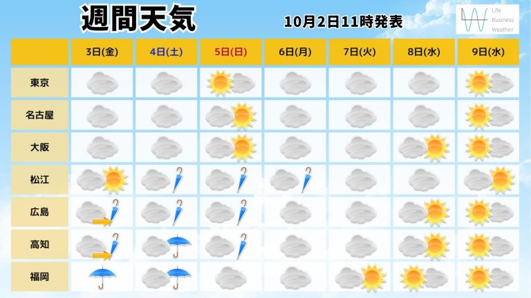この先は、関東から九州で雲が多めの天気が続きそうです。西日本では週明け6日(月)にかけて傘の出番が続き、次の晴天は早くとも来週の中頃になりそうです。