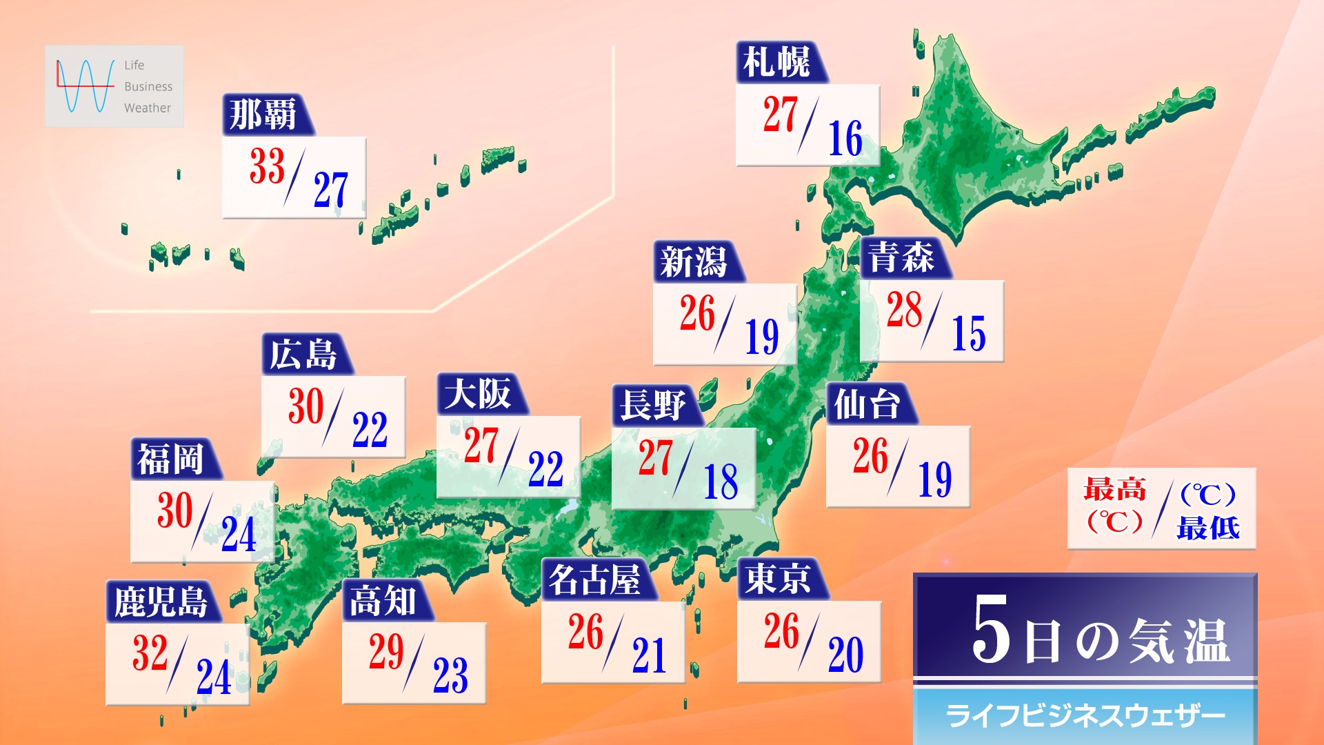 北海道から近畿は27度ぐらいですが、中国・四国や九州は30度前後まで上がり、晴れ間が出て真夏日になる所もあり、厳しい残暑になりそうです。お出かけには水分を持ち歩き、こまめな補給を心掛けてください。