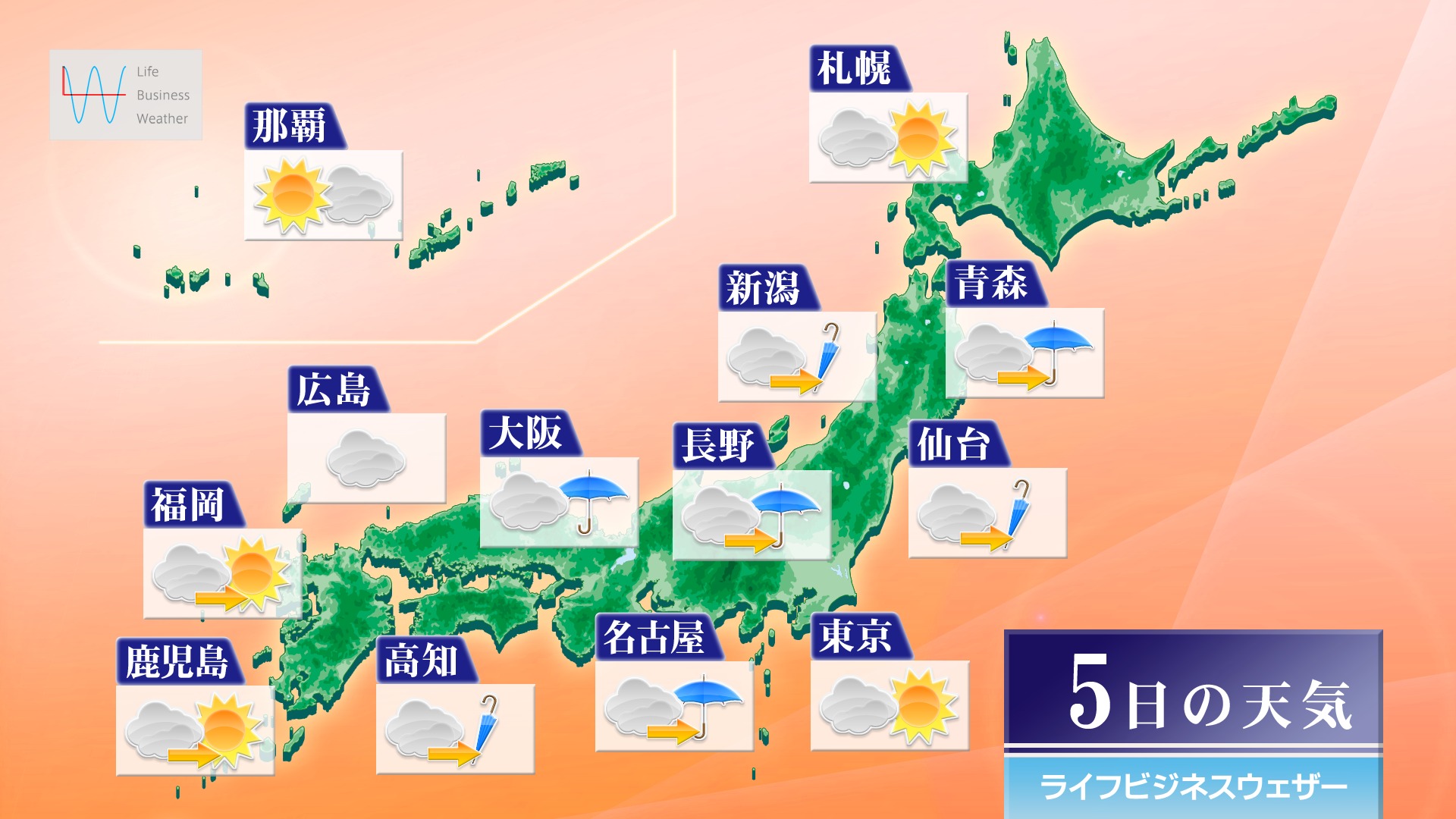 明日5日(日)は低気圧が接近するため、北海道から九州は雲が多めでしょう。特に低気圧に近い東北日本海側から近畿は、雨の時間が長くなるため、お出かけには傘の用意があると安心です。北海道や関東、九州では晴れ間もありますが、急なにわか雨にお気を付けください。