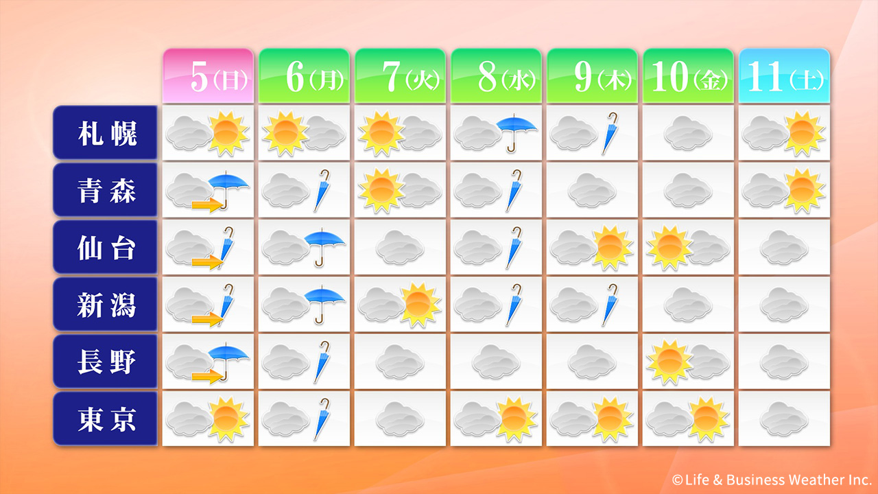 向こう1週間は、天気が短い周期で変わるでしょう。週明け6日(月)にかけては東北や北陸、関東で、8日(水)から9日(木)は北日本や北陸を中心に雨が降り、来週中頃は荒天となる可能性がありますので、飛ばされやすい物を室内にしまうなど、対策を行なってください。荒天のあとは上空に強い寒気が入り、北海道の山間部では雪になる所があるでしょう。