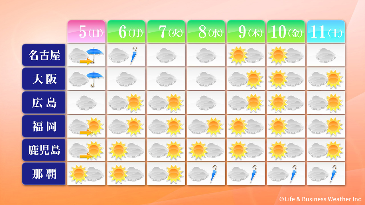 東海から西日本の天気は、明日5日(日)は東海や近畿、中国地方で雨の残る所がありますが、週明け6日(月)以降は日差しが戻りそうです。ただ、湿った空気の影響を受け、すっきりとは晴れず、雲が多めの空が続くでしょう。