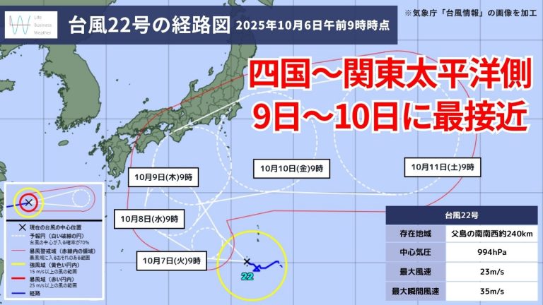 昨日5日(日)に発生した台風22号は、今日6日(月)午前9時時点で父島の南南西の海上をゆっくりと西よりに進んでいて、明日7日(火)は強い勢力で日本の南へと進むでしょう。9日(木)には一時的に非常に強い勢力へと変わり、10日(金)には強い勢力で日本の東へ達しそうです。