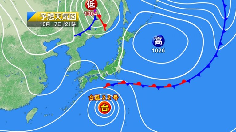 また、台風22号は今日7日(火)9時現在、日本の南を西よりに進んでいます。このあとは、発達しながら日本の南を北西に進み、明日8日(水)には進路を次第に北東に変え、明後日9日(木)には非常に強い勢力で伊豆諸島に接近するでしょう。伊豆諸島では、明日8日(水)は、暴風やうねりを伴う高波に厳重に警戒し、大雨災害に警戒してください。
