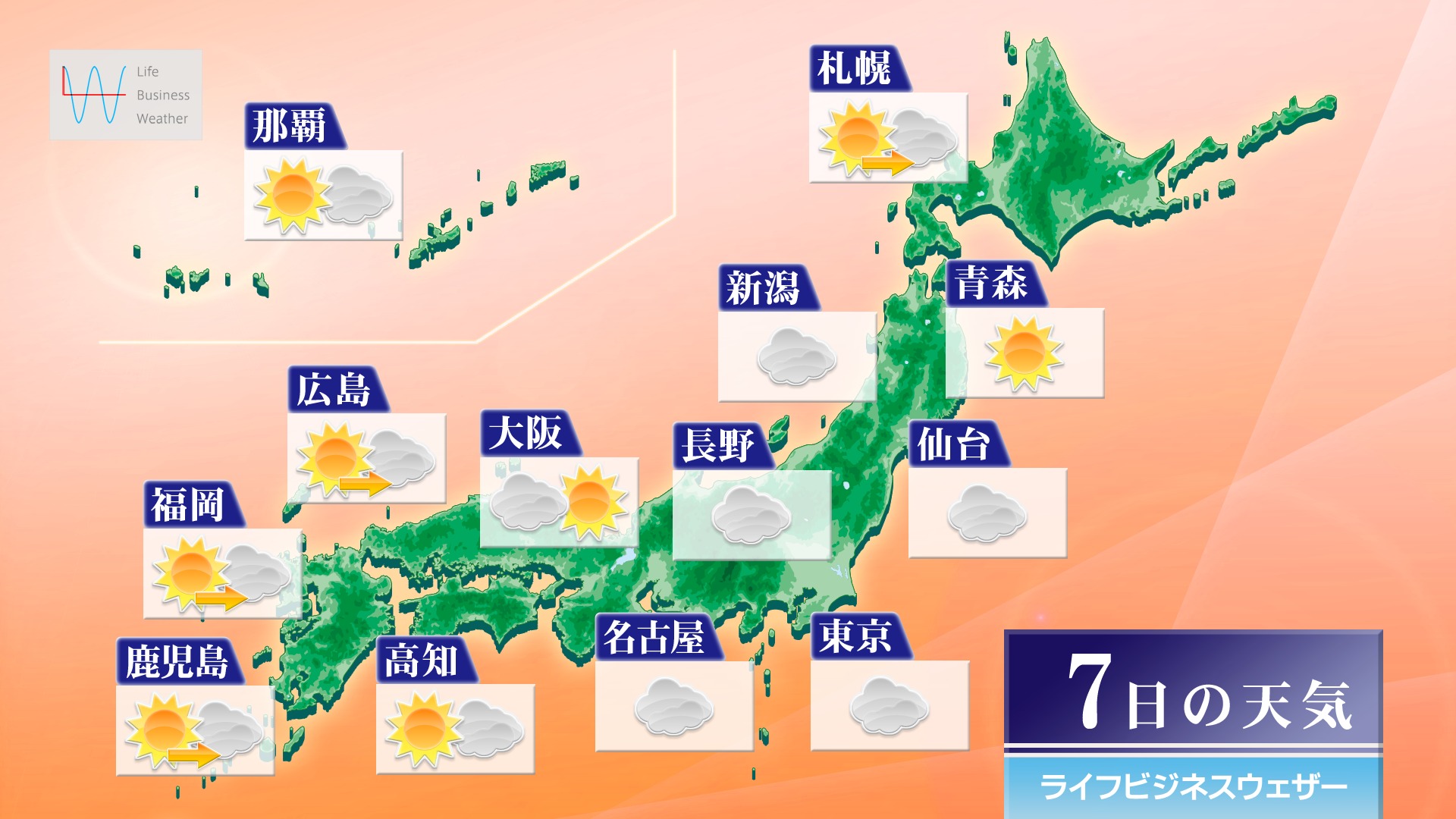 今日7日(火)午後は、湿った空気の影響で、東北南部から北陸、東海は、雲が広がり、雨の降る所があるでしょう。北海道や東北北部も次第に雲が増え、夜の遅い時間は北海道で雨や雷雨になる所がありそうです。近畿から九州は晴れ間がありますが、夜は九州で雨の降る所があるでしょう。沖縄本島はおおむね晴れますが、にわか雨にご注意ください。