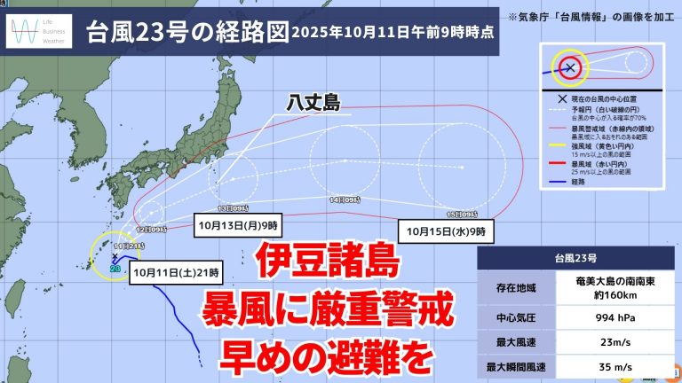 なお、スポーツの日の13日(月・祝)にかけては伊豆諸島付近を台風23号がかなり接近し、先日大きな被害が発生した台風22号と同じようなコースをとなりそうです。伊豆諸島では再び走行中のトラックが横転するおそれのある猛烈な風が吹くと予想され、局地的に激しい雨が降り、普段よりも災害の発生するリスクが高まっています。明日の明るい時間のうちに、安全な場所に避難してください。