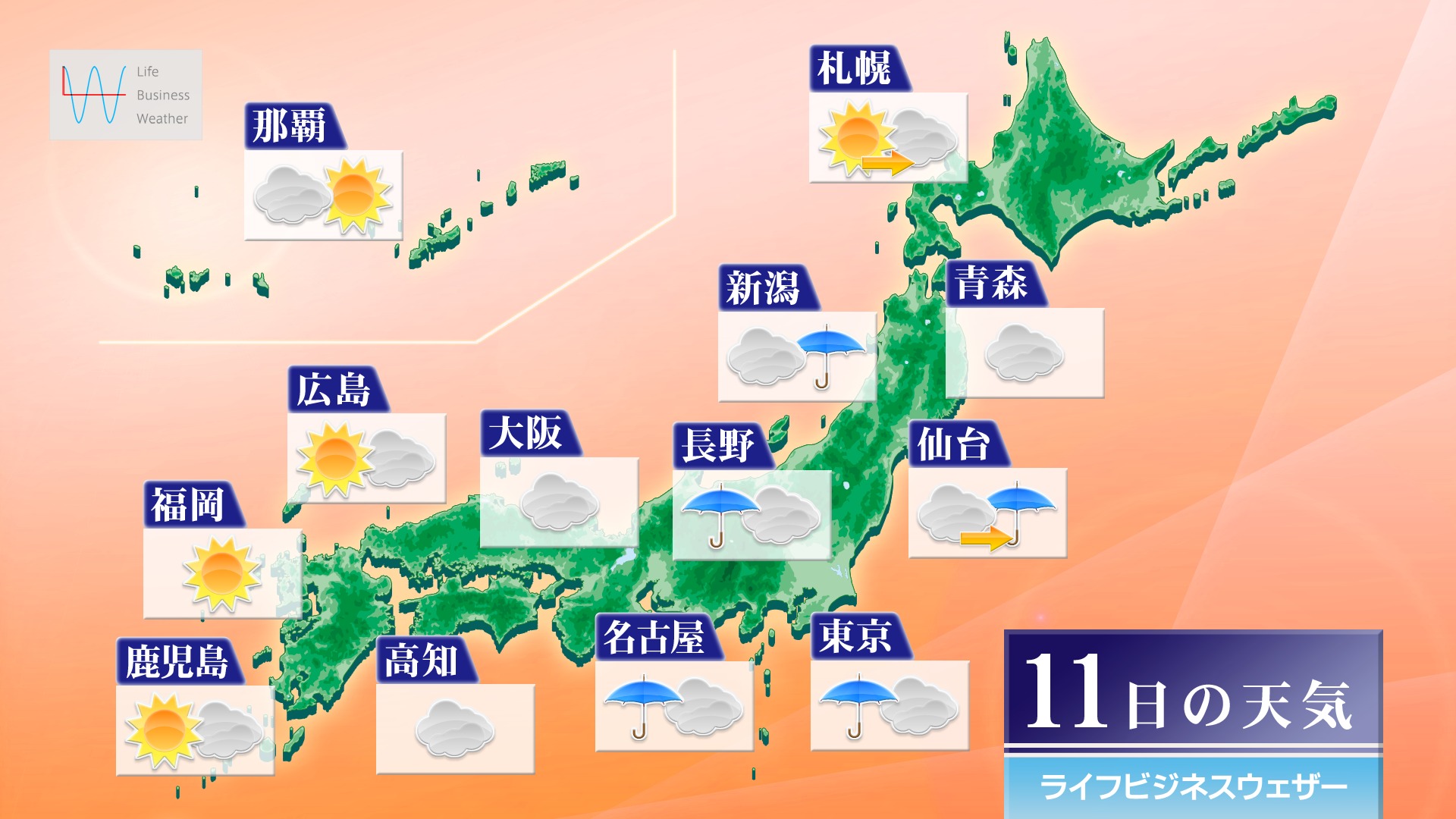 明日12日(日)は台風23号が本州の南の海上を通過し、別の低気圧が本州付近を通過しそうです。このため、北海道から中国・四国は雲が多めでしょう。東北は雨が降ったり止んだりして、関東から四国も沿岸部ほど雨の降る時間帯がありそうです。九州や沖縄は青空が広がり、天気は回復に向かうでしょう。