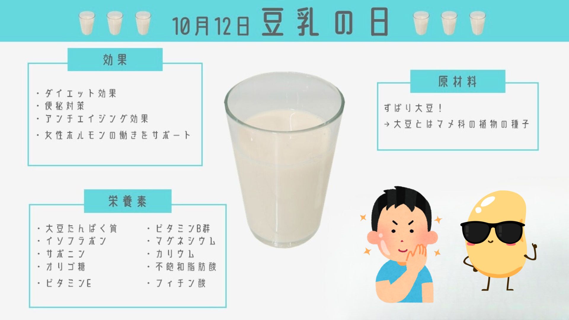 今日10月12日は「豆乳の日」です!豆乳は大豆を搾って作られる飲料で、近年では、健康志向や植物性食品ブームの高まりによって広い世代に人気となっています。
