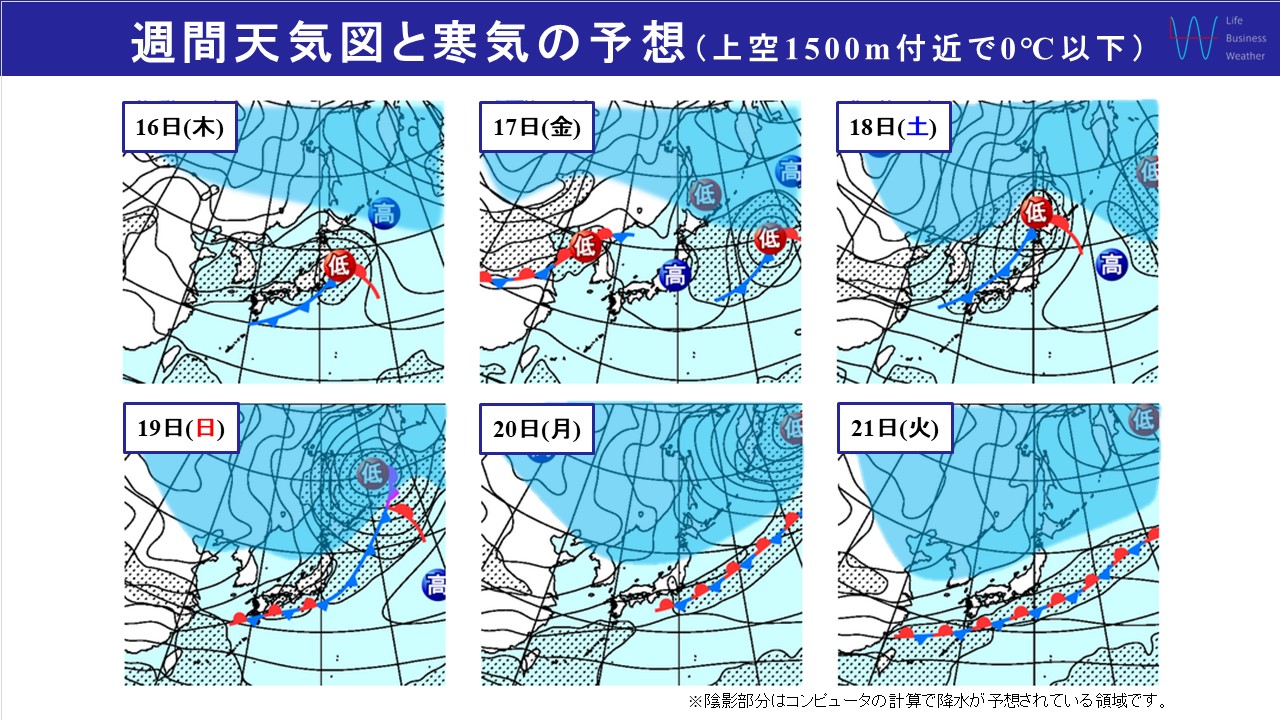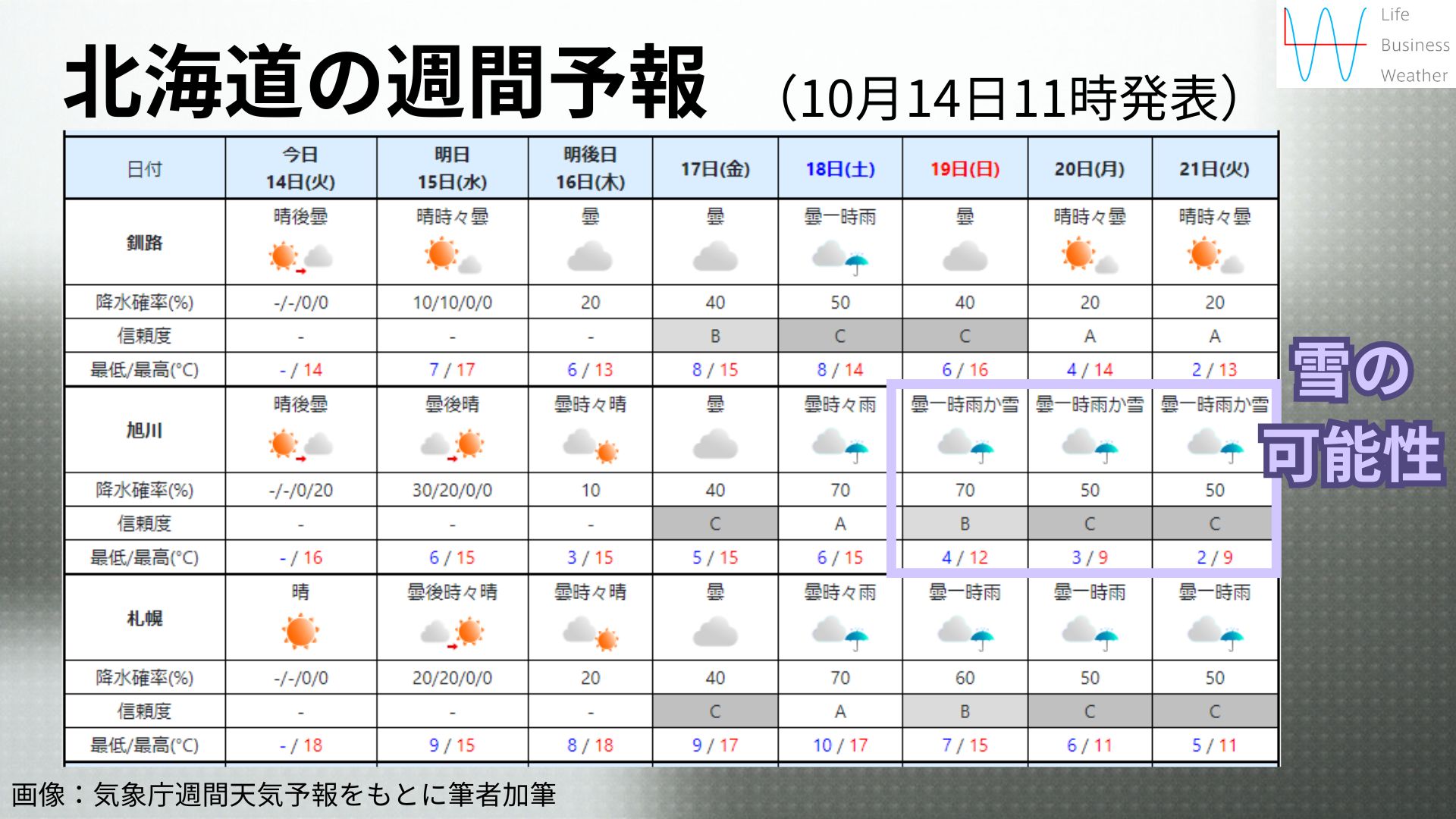 特に北海道には強い寒気が流れ込み、19日(日)以降は山間部を中心に積雪が予想され、特に旭川は気温の低い時間帯に雪の混じる可能性があります。雪が降れば『初雪』の可能性も高く、時間帯によっては雪の積もる可能性があります。
