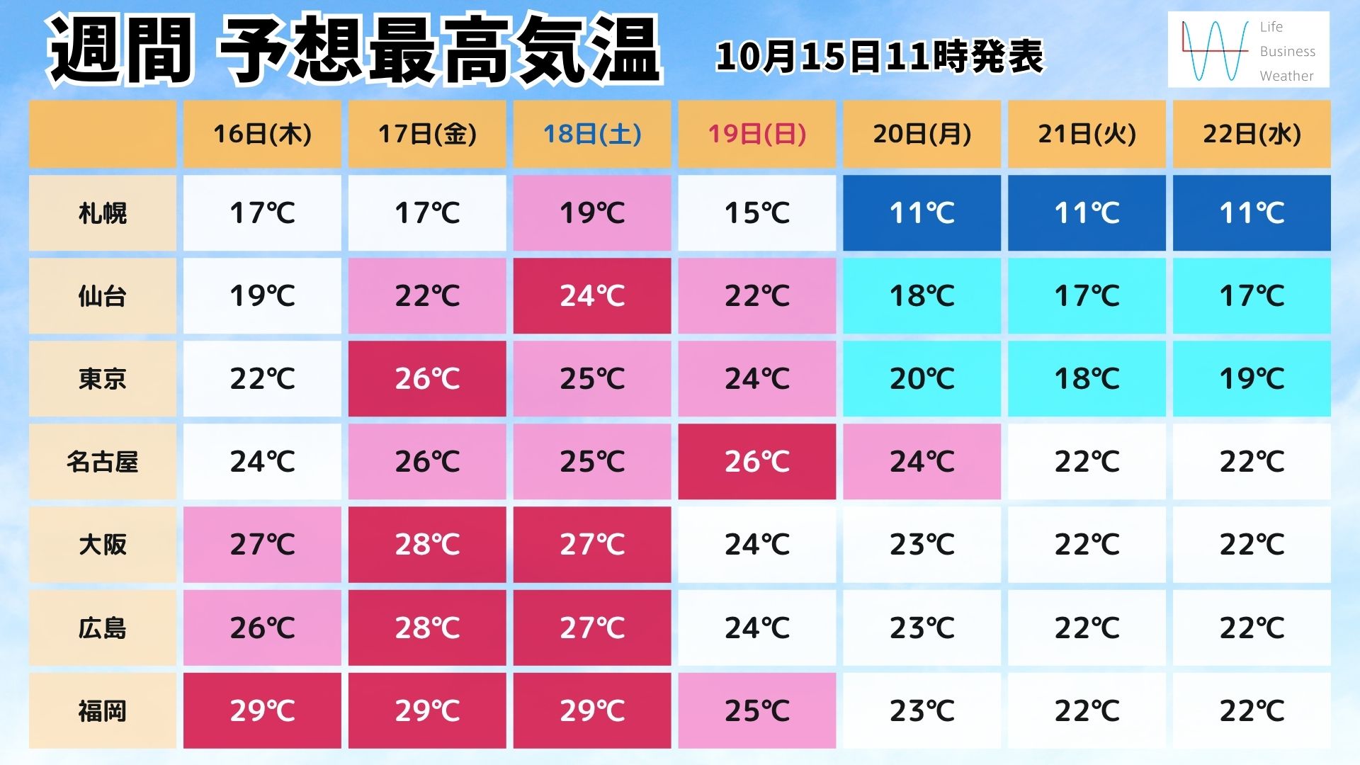 最高気温は、北海道では19日(日)までは17度ぐらいですが、20日(月)以降は10度に届くかどうかとなり、朝晩も冷えそうです。東北や北陸、関東も今週末を境に気温が変わり、19日(日)までは24度前後の所が多いものの、20日(月)以降は18度ぐらいにとどまるでしょう。雨や風で体感としてはさらに肌寒く感じられそうです。ニットや秋コートを用意してください。