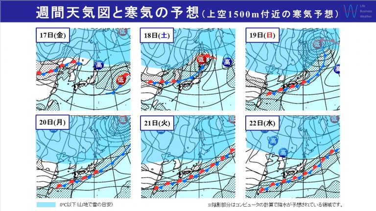17日(金)は回復傾向ですが、18日(土)から19日(日)は発達する低気圧や前線が通過し、全国的に雨や風が強まって、荒れた天気となるでしょう。また、通過後は北日本中心に西高東低の気圧配置となって、寒気が流れ込むため、北海道は山地を中心に雪となり、旭川など初雪の便りが届くかもしれません。冬支度がまだの方は準備を急いでください。
