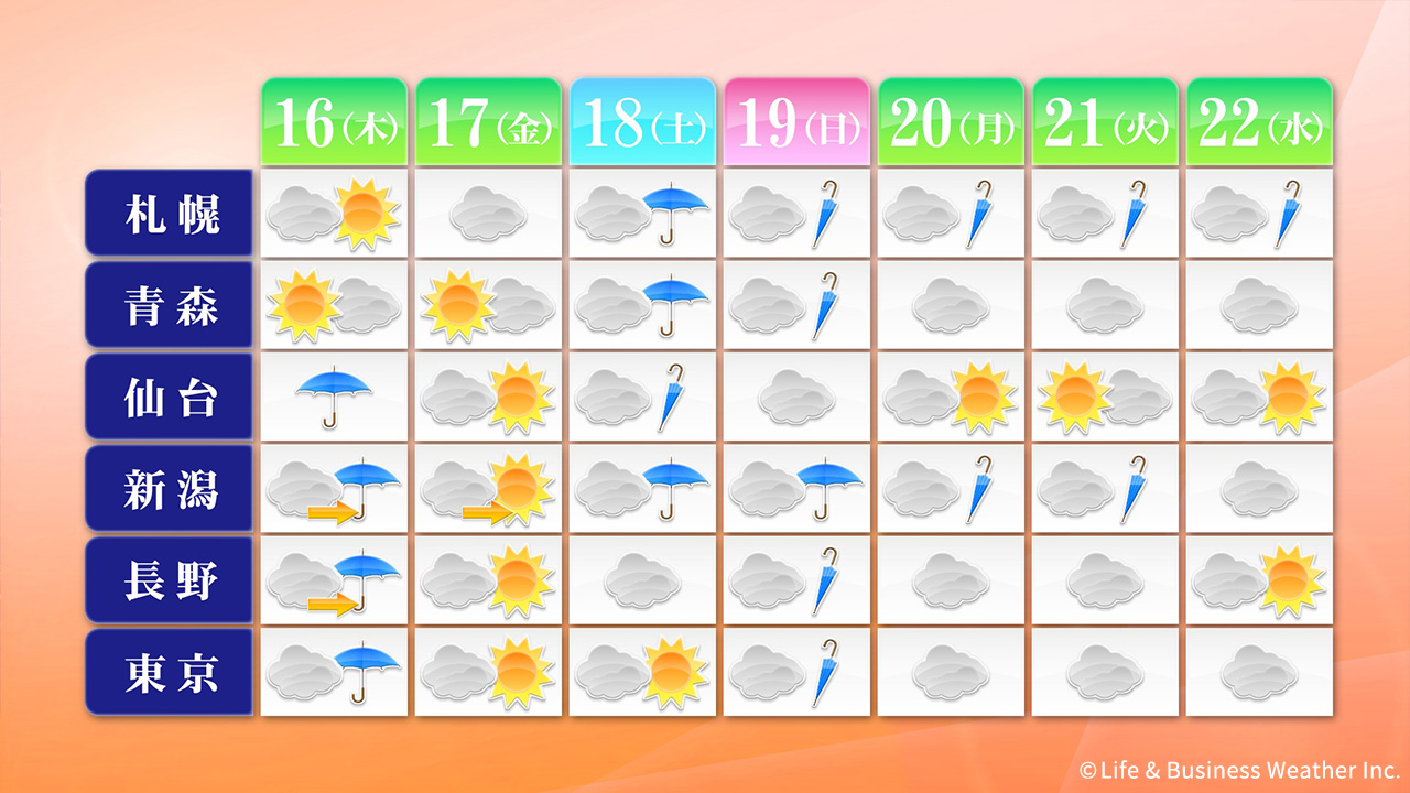 東北や北陸、関東もくもりや雨の天気が続き、18日(土)から19日(日)は日本海側中心に雨や風が強まるでしょう。