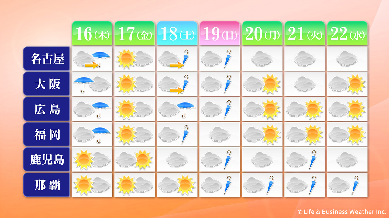 最高気温は、東海から九州では18日(土)までは雨でも28度ぐらいまで上がるでしょう。19日(日)以降は徐々に気温が下がり、週明けは日差しがあっても22度ぐらいと過ごしやすくなりそうです。沖縄は30度前後で、雨が降る19日(日)以降はかなり蒸し暑いでしょう。