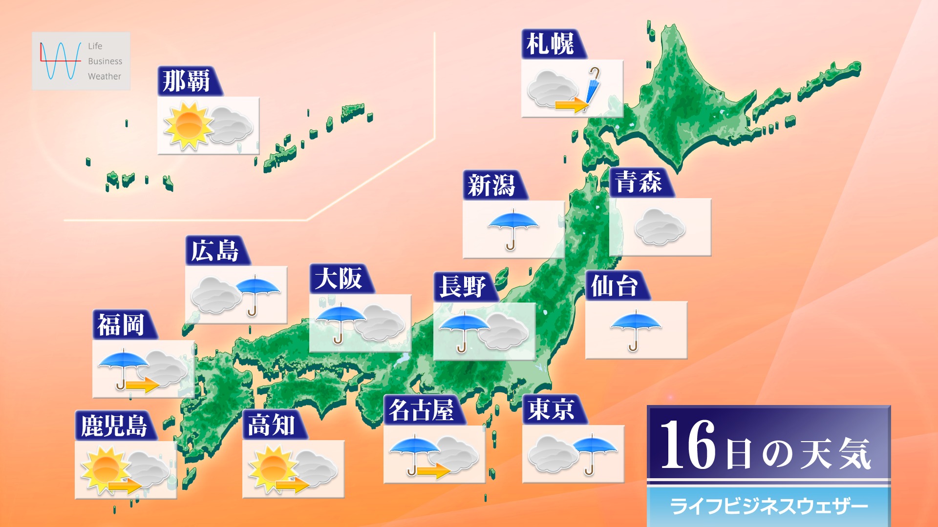 今日16日(木)のこのあとは前線を伴った低気圧が日本海から接近するため、北海道から九州北部は雨が降ったり止んだりするでしょう。東北南部と北陸から九州北部は、雷を伴って雨脚の激しくなる所がありそうです。北陸では、明日朝までの降水量が多い所で120ミリとなり、警報級の大雨となる可能性があります。雨の降り方に注意・警戒をしてください。