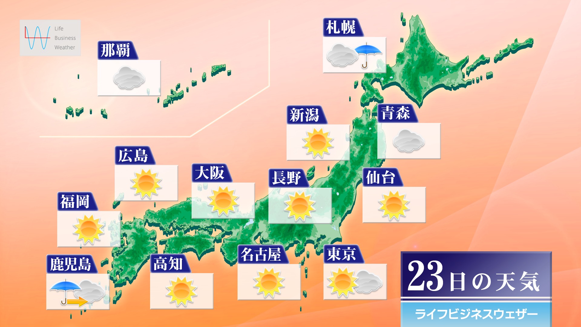 最高気温は、北海道で10度ほどと平年以下の寒さが続きますが、関東や東海では20度前後、西日本は23度ぐらいまで上がり、冬のような寒さだった昨日22日(水)よりグッと高くなるでしょう。