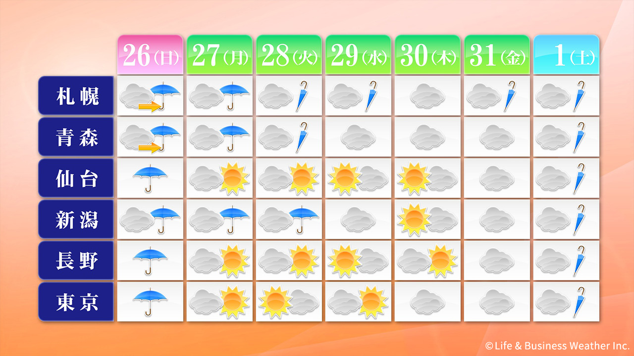 北海道~関東は、27日(月)と28日(火)は、日本海側で雨や雪が降るでしょう。北海道は雪の範囲が広く、平地でも雪になる可能性があります。また、等圧線の間隔が狭くなるため、北日本では北西の風が強く吹くでしょう。低気圧の発達の程度によっては大荒れや大しけとなる可能性もあります。28日(火)の最高気温は北海道で10度に届かない所があり、グッと冷え込むでしょう。29日(水)~30日(木)は、東日本を中心に日差しが届きそうです。31日(金)は雲が広がり、1日(土)はまとまった雨が降るでしょう。