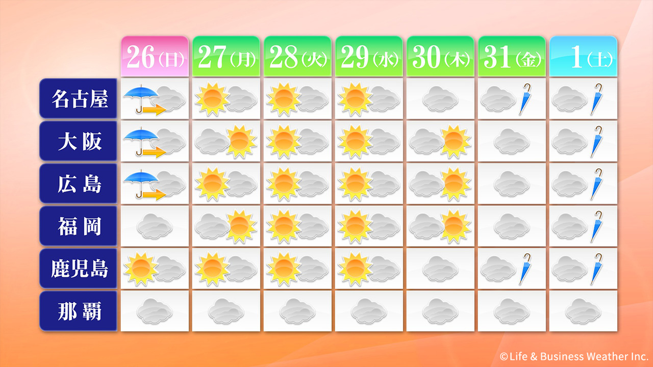 東海~九州は、27日(月)と28日(火)は太平洋側ほど晴れるでしょう。28日(火)は西日本でも20度を下回る所が多くなりそうです。29日(水)は日本海側も含め広く秋晴れとなりそうです。30日(木)は雲が増え、31日(金)は太平洋側を中心に雨が降るでしょう。1日(土)は、雨は朝までで、しだいに天気が回復しそうです。沖縄は、停滞する前線の影響で、くもりや雨の日が多いでしょう。