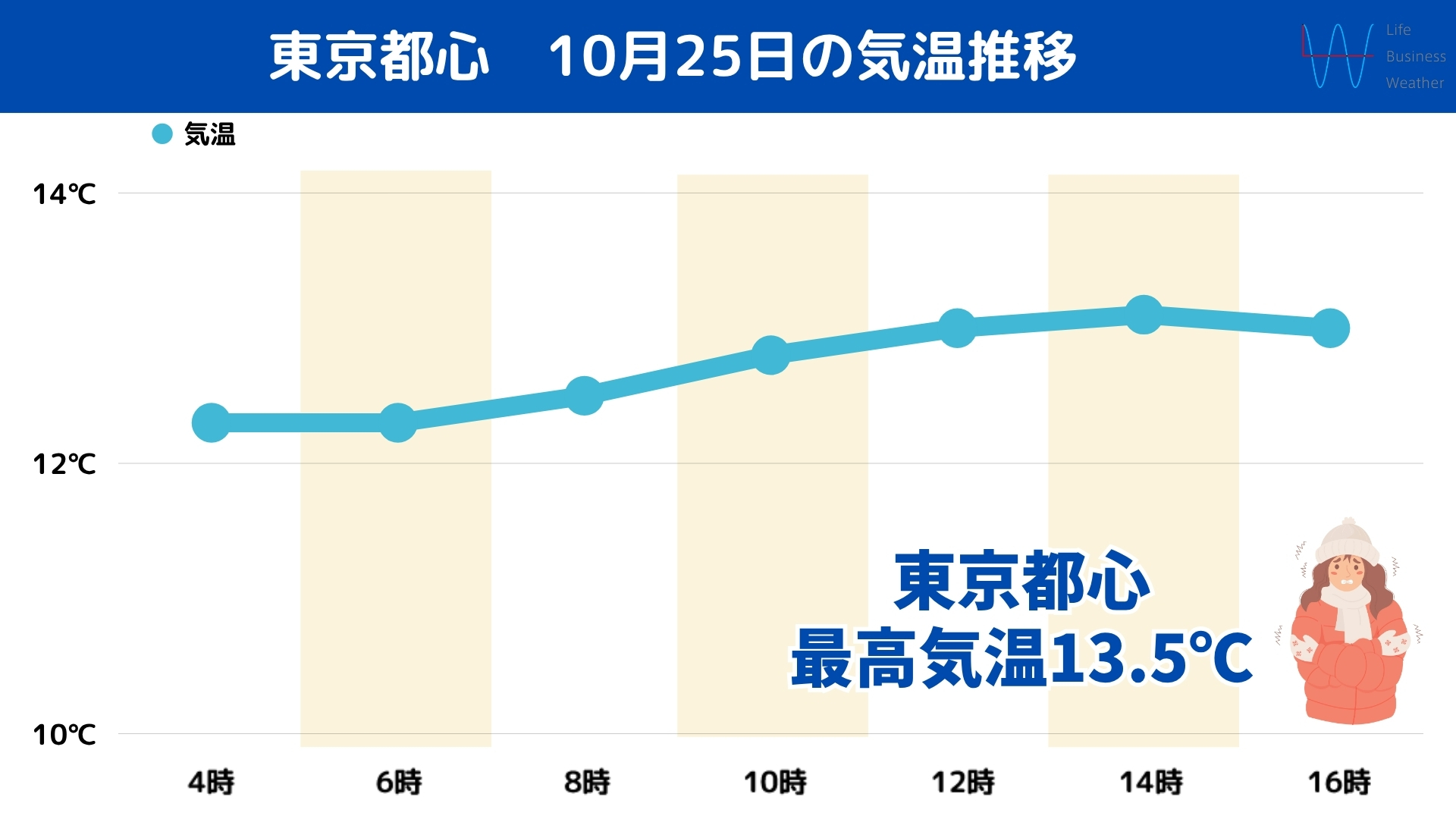 今日25日、東京都心は雨が降ったり止んだりで、気温は横ばい。最高気温は13.5℃で、12月上旬並と今シーズン一番の寒さとなりました。その他、千葉や横浜などでも、今季一番気温の上がり方が鈍く、北寄りの風が身に染みる一日に。