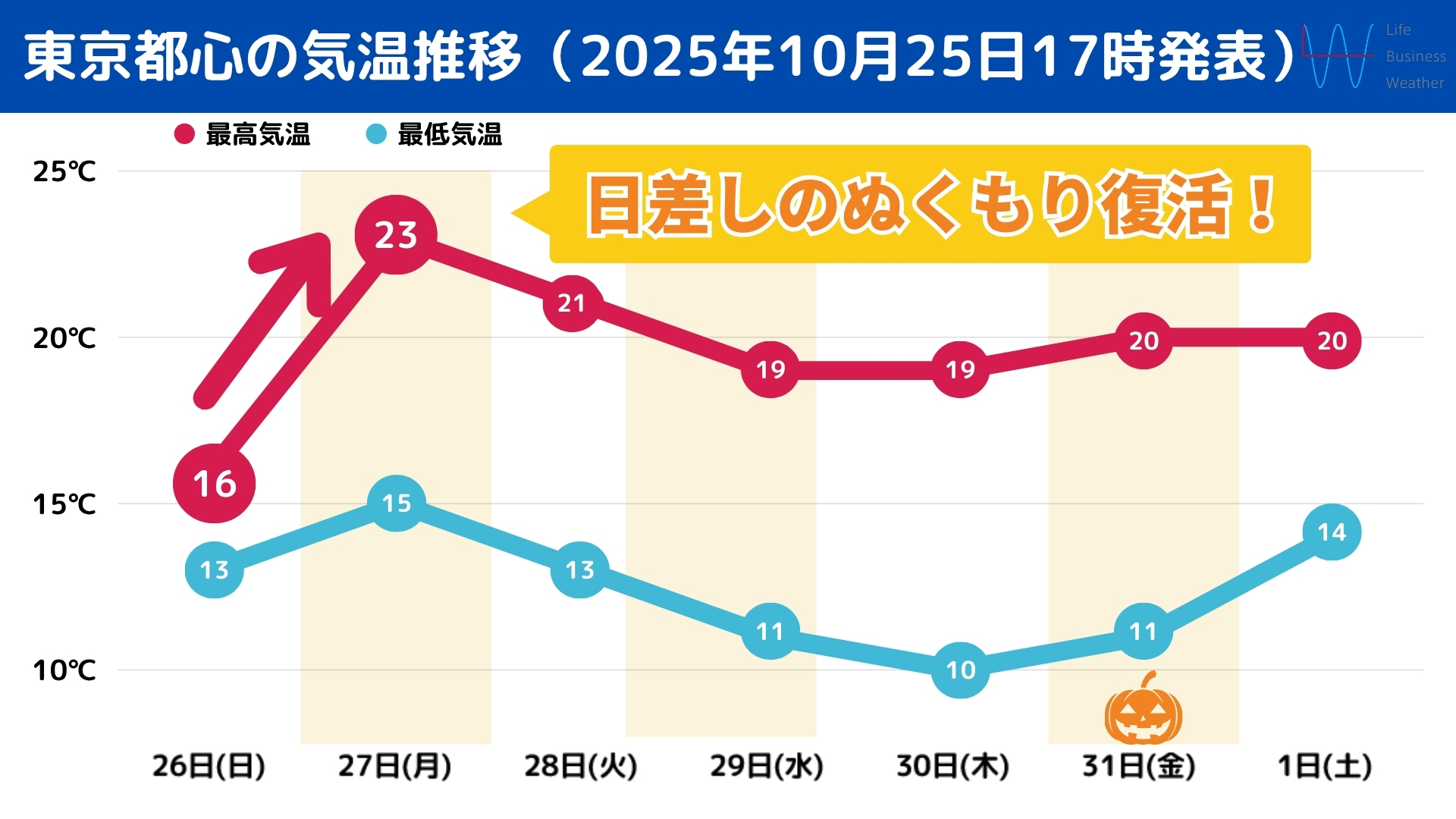 冷たい雨は明日26日までで、週明け27日には、天気が回復し、気温がグッと上がりそう。日中は23℃の予想で、日差しのぬくもりが戻ってきそうです。その後は20℃前後で推移するでしょう。