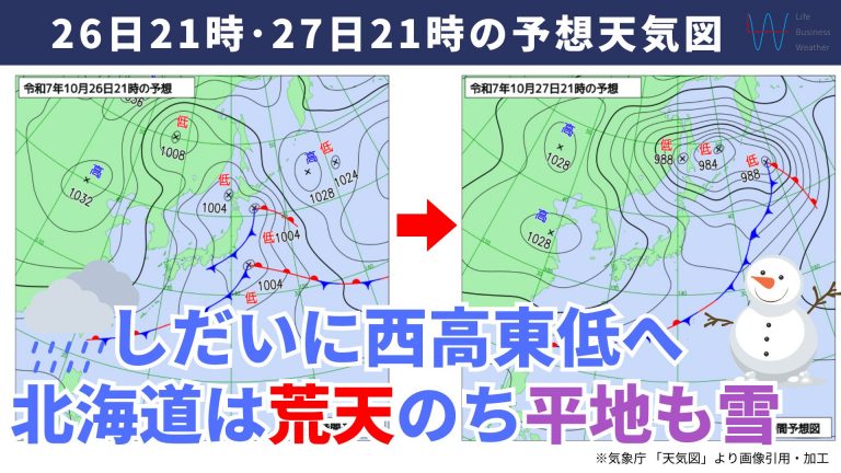 明日27日(月)は西高東低の気圧配置に変わり、上空には強い寒気が流れ込むでしょう。北海道日本海側から九州北部は雨が降ったりやんだりしそうです。北海道では夜遅い時間ほど雨が雪に変わり、札幌など平地でも雪の降る可能性があります。シーズン初の積雪になる可能性がありますので、雪道の装備がまだという方は、早めに済ませてください。北海道太平洋側から九州南部は、多少雲が広がりますが、晴れる所が多いでしょう。