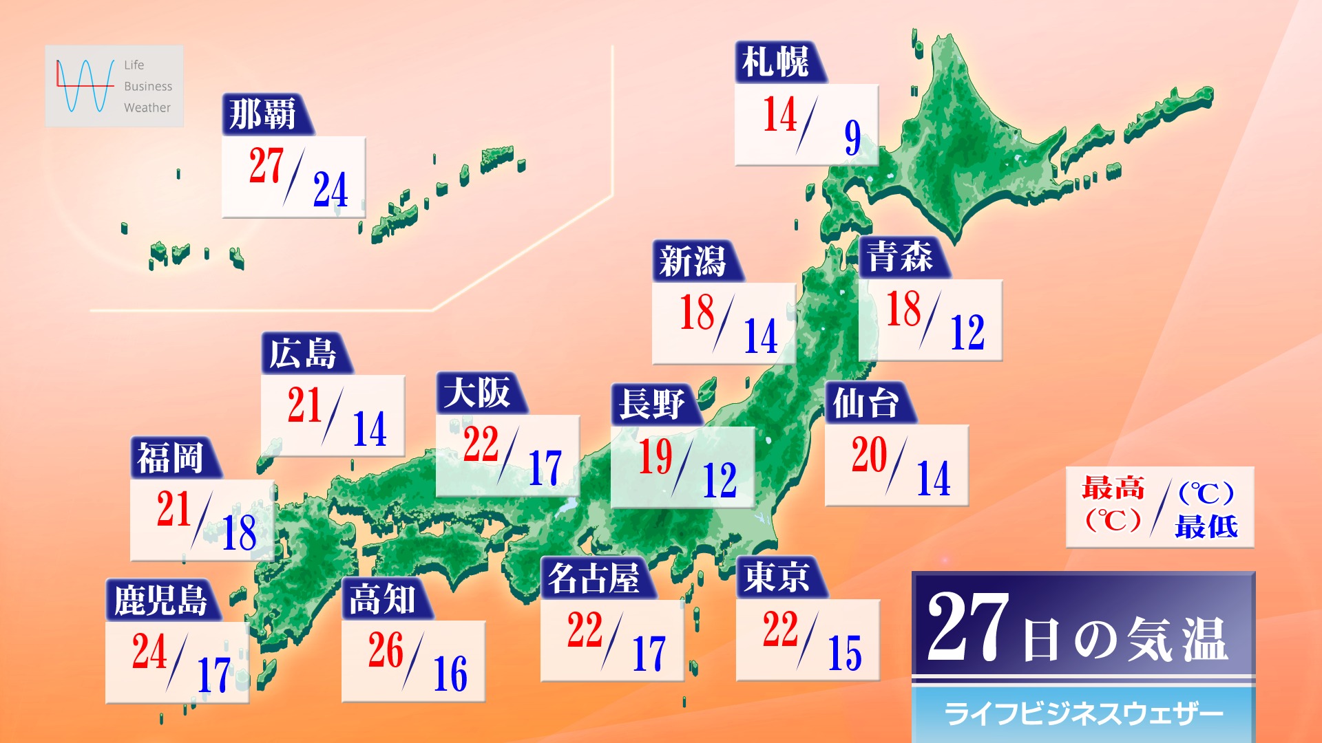 日中の最高気温は、北海道から近畿は18度前後で、関東は15度を少し超える程度にとどまり、11月中旬並みの寒さになる所がありそうです。晴れ間のある西日本は20度を超え、四国や九州は夏日地点もあるでしょう。