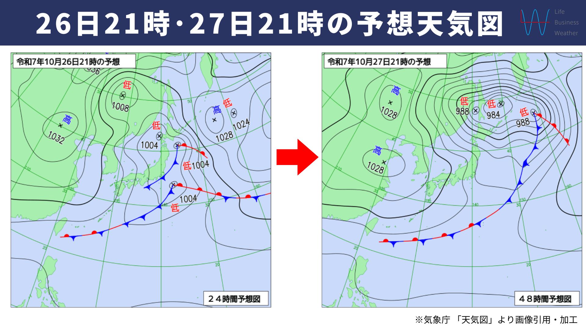 今日26日(日)は北海道から近畿で、広く雨が降りますが、明日27日(月)は関東や近畿の天気は回復へ向かうでしょう。ただ、低気圧は北海道付近で発達し、本州付近は西側の大陸に高気圧があり、東側のオホーツク海に低気圧が位置する、いわゆる『西高東低の気圧配置』に変わるでしょう。