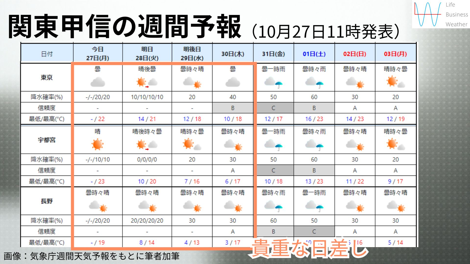 今週前半は高気圧に覆われるため、比較的日差しが出るでしょう。ただ、週末は低気圧や前線の影響で、まとまった雨となり、11月のはじまる1日(土)は雨の時間が長くなりそうです。都心は9月中旬以降、土日のどちらかに0.5mm以上の降水を観測していて、今週も雨なら8週連続となるでしょう。