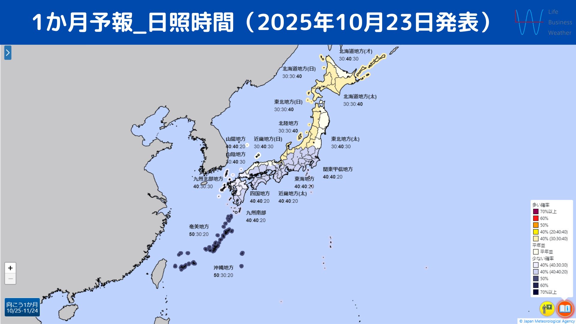 さらに先週23日(木)に発表された最新の1か月予報によると、東日本太平洋側から九州南部は、日照時間が平年並みか、平年に比べて少なくなる予想です。沖縄・奄美も平年に比べて晴れる日が少なく、日照時間は平年より少なくなるでしょう。