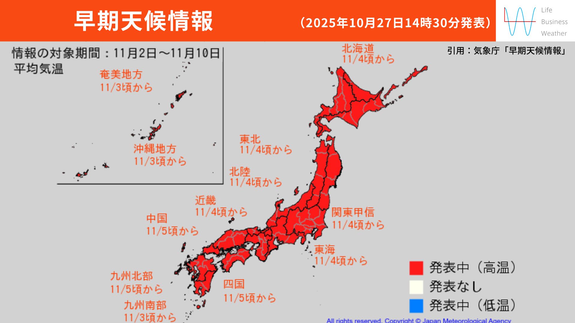 連休明け4日(火)以降は、暖かな空気に覆われ、一旦季節は逆戻りしそうです。今週27日(月)に発表された早期天候情報によると、全国的に11月3日(月・祝)~4日(火)以降は気温が平年より高く、10年に1度クラスの高温が予想されています。農作物の管理などにご注意ください。